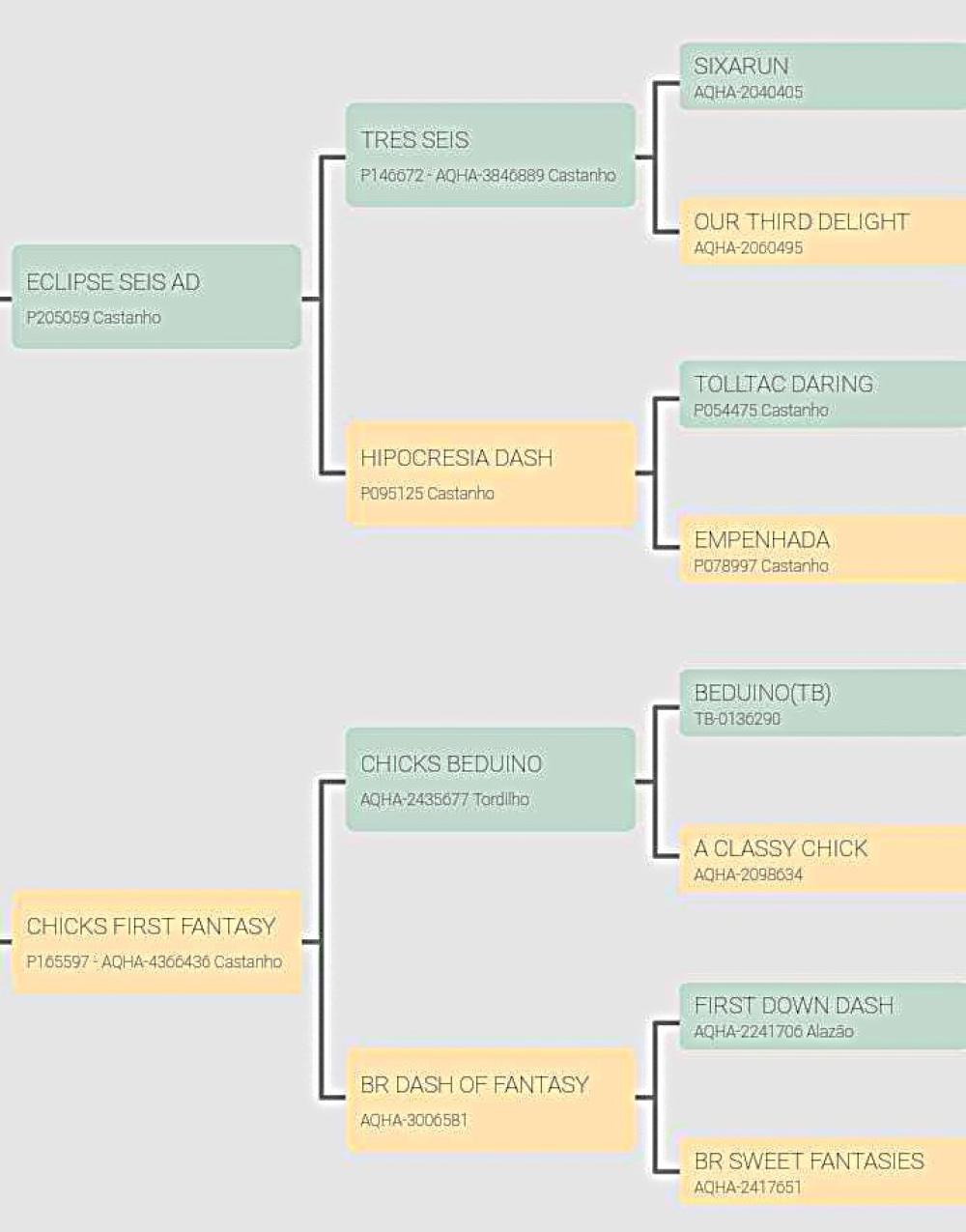 Seu pai ECLIPSE SEIS AD é filho de TRES SEIS, AAA-97 6 vitórias em 12 atuações e U$856.901,00 em prêmios. AQHA Racing Champion Two-year-old-colt, sendo o 17º Melhor Reprodutor de todos os tempos. Pai de ganhadores de U$30.000.000,00. Com 17 gerações em idade de corrida é pai de 741 ROMs, 36 ganhadores clássicos, 27 Superior Race Awards, 10 Regional Champions e 1 Champion, incluindo OCHOA (Animal mais premiado em Corrida em todos os tempos. AAA-99, 9 vitórias, U$2.781.365,00, 4x Champion, 1° no All American Futurity (G1), 1° no All American Derby (G1), 1º no Rainbow derby (G1), 1º no Robert L.Boniface Los Alamitos Inv.Champ.(G1), etc). Nos Três Tambores, TRES SEIS é o 14º Melhor Reproduror de todos os tempos nos Estados Unidos, sendo pai de ganhadores de U$2.584.198,00, com destaque para TRES MOVIDAS (U$283.292,00. Campeã do WCRA Womens Rodeo World Open Championship, Campeã do Pink Buckle Average Open 1D, etc). No Brasil, na corrida é produtor de +R$1.000.000,00 no Jockey Club de Sorocaba com 6 gerações em pista. 3º Melhor Reprodutor de 2015, 5º Melhor Reprodutor de 2016 e 6º Melhor Reprodutor de 2017 nas Estatísticas do Jockey Club de Sorocaba por soma produzida. Destaque para SIX THREE BEDUINO: AAAT-107. 5 vitórias e R$234.400,00 em prêmios. 1º no GP Super Sprint/17, 1º na Consolação do GP Meragace/17, 2º no GP ABQM Rei da Velocidade/18, 2º no GP Presidente da ABQM-II Derby/18, 2º no GP Breeders Derby/18, etc.. Nas modalidades de Trabalho, é produtor de 6.495,00 pontos pela ABQM e R$2.779.211,50 pelo SGP Sistema (5º Melhor Reprodutor de todos os tempos pelo SGP Sistema), 6º Melhor Reprodutor de todos os tempos em Três Tambores pela ABQM, 6º Melhor Reprodutor de todos os tempos em Trabalho pela ABQM. Como Avô Materno, em Corrida suas filhas produziram U$24.878.308,00, o colocando como o Avô Materno Nº1 de todos os tempos por média de ganhos de seus netos. Um dos maiores produtores de todos os tempos da raça!
