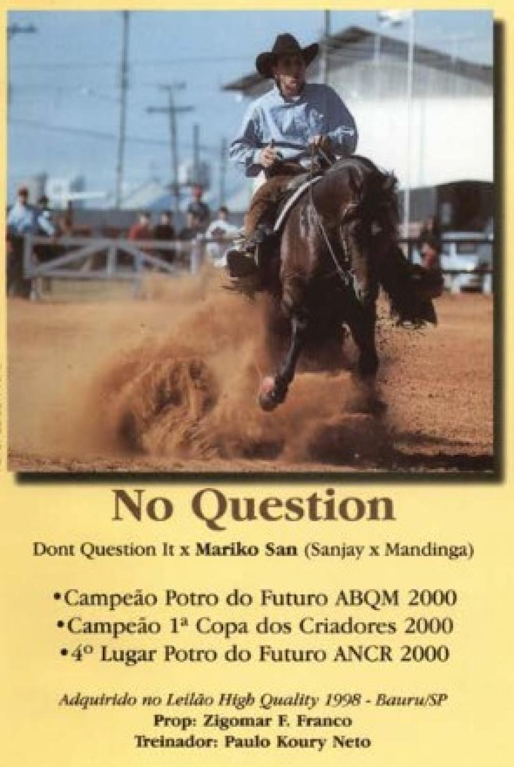 Seu pai MAX DONT QUESTION é filho de NO QUESTION, 91 pontos e RMT Superior em Rédeas na Classe Aberta pela ABQM e R$118.440,00 em prêmios pela ANCR. Tanto pela ABQM quanto pela ANCR, é o 2º melhor animal de Rédeas no Brasil em todos os tempos. Campeão Snaffle Bit ANCR, Res.Campeão Potro do Futuro Rédeas ANCR, Campeão Potro do Futuro ABQM, Campeão Nacional ABQM, Campeão Derby ANCR, Campeão VII Sacramento/Caruana Classic Reining ANCR, Campeão do 1º Santa Helena/Haras Dan de Rédeas, Campeão Show Oficial AQHA. Produtor de 186,75 pontos na ABQM em diversas modalidades e R$92.815,00 em Rédeas pela ANCR. Pela ABQM é o 21º melhor reprodutor de Rédeas em todos os tempos. Dentre seus filhos destacam-se: SO MUCH FUN, Res.Campeã do Potro do Futuro ANCR (Aberta e Amador), etc.; HOLLYWOOD MOONLIGHT, Res.Campeão do Santa Helena/Haras Dan Futurity, 3º lugar no Potro do Futuro ABQM e ANCR (Aberta), etc. Avô materno de animais que acumulam 456,75 pontos na ABQM em Trabalho, sendo o 9º melhor Avô materno de Rédeas em todos os tempos pela ABQM.
