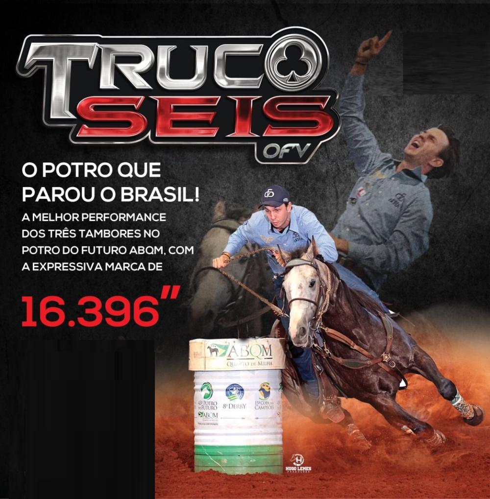 Seu pai, TRUCOSEIS OFV, foi o potro mais rápido do mundo nos Três Tambores, sagrando-se Campeão do Potro do Futuro ABQM na categoria Amador Masculino com a incrível marca de 16,396!! Ainda em campanha, já soma 93,00 pontos pela ABQM e R$ 57.836,00 em ganhos pelo SGP. Um dos mais promissores garanhões da nova geração, descendente de dois ícones mundiais, TRES SEIS e MISS FORTUNES FOOL.